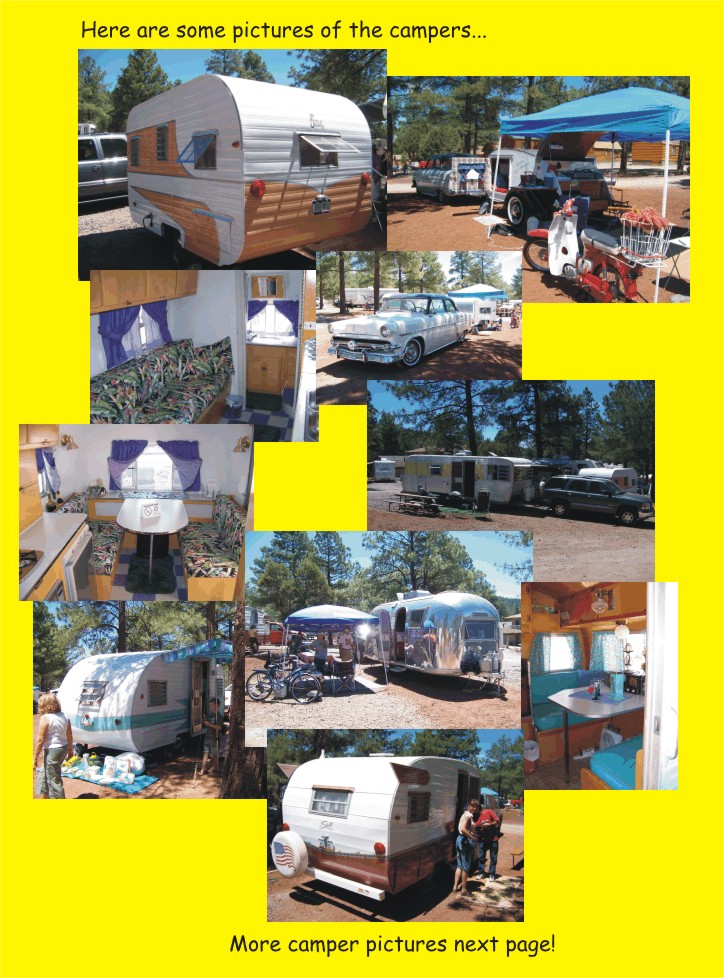 The Circle Pines KOA was the site of our 3rd annual June Rally. We had close to 50 Vintage trailers from Arizona, New Mexico, California, Nevada and a few other states come to enjoy the cool mountains of central Arizona. Several campers made the short trip over to the Grand Canyon while others chose to stay and enjoy the campground. We really want to thank everybody that worked hard to make this happen, as well as those that helped out at the rally. Prev 1 - 2 - 3 - 4 - 5 - 6 - 7 Next