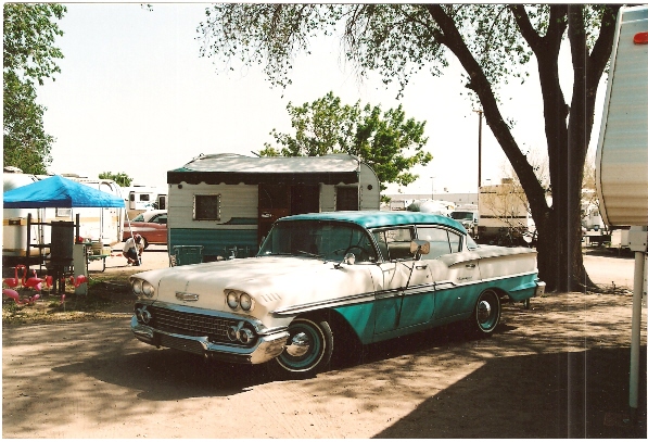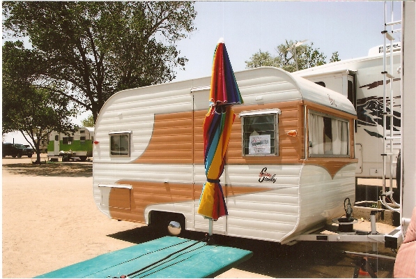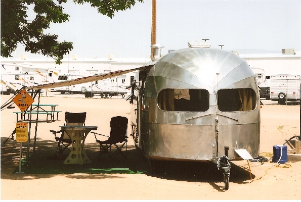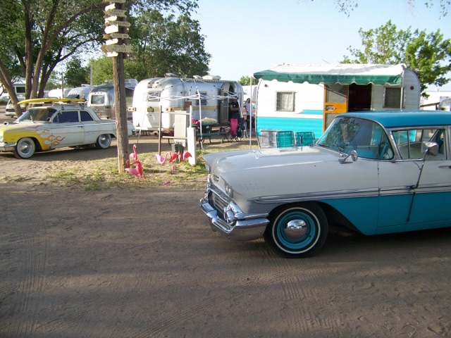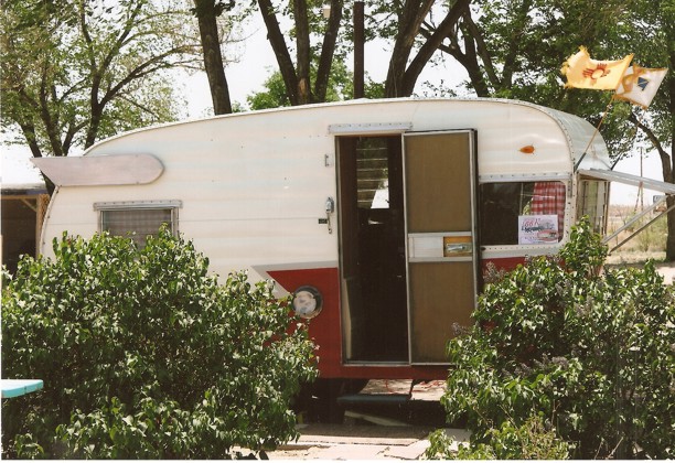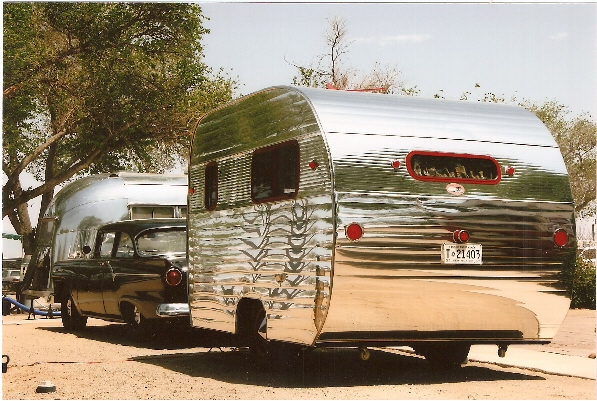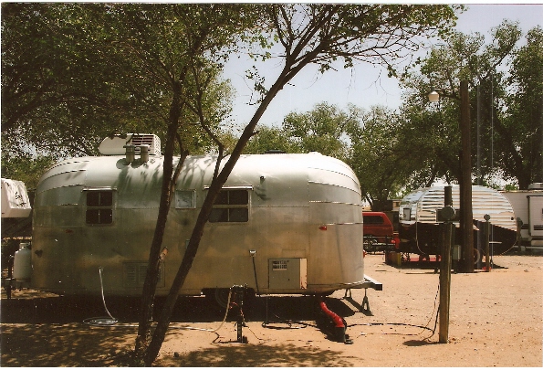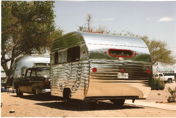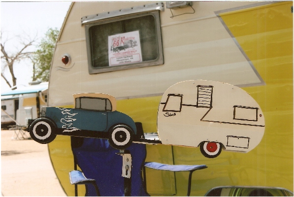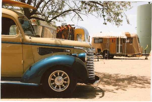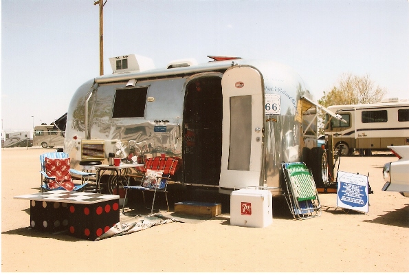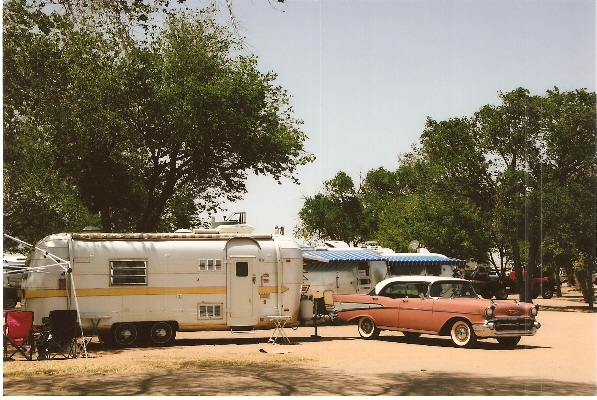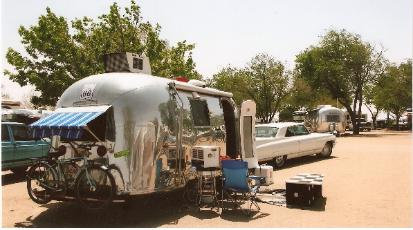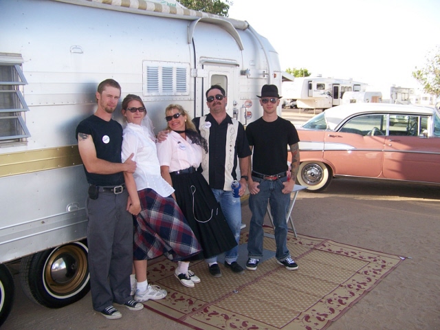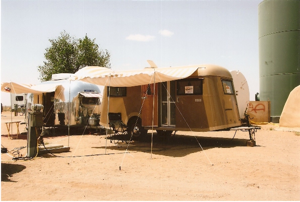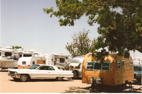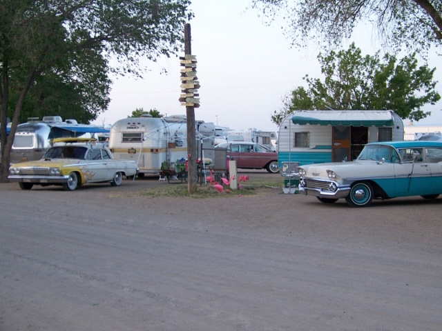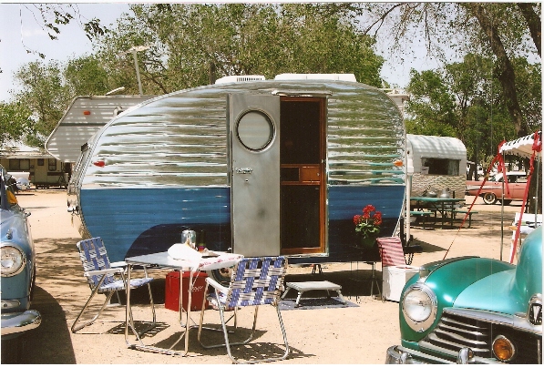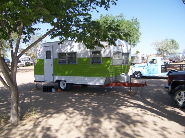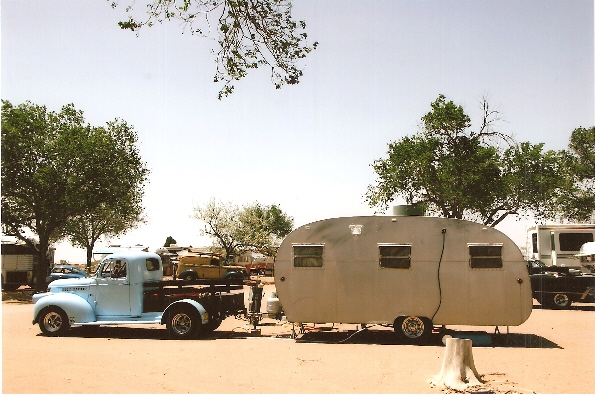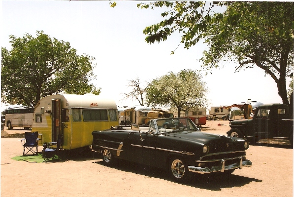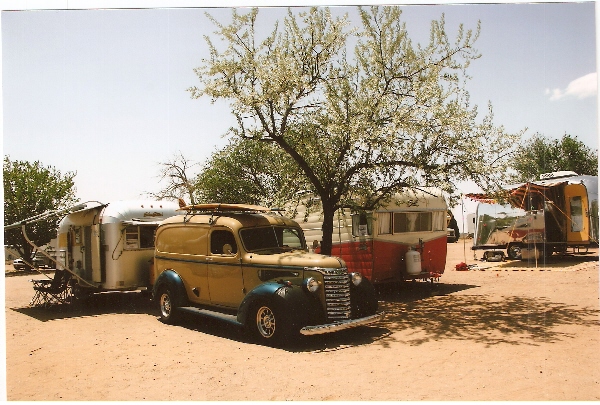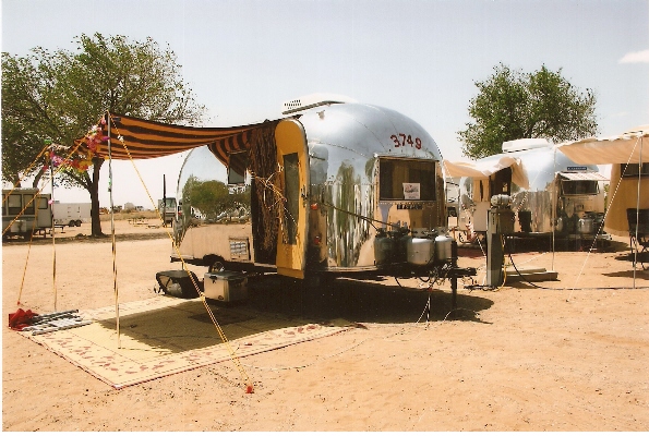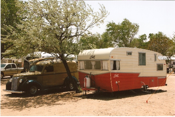 Great turnout for this first time event! About 35 Vintage campers, many pulled by classic cars and trucks made the trek to the top of Nine Mile Hill just west of Albuquerque. The Enchanted Trails was originally the Hilltop Trading Post right on old Route 66, a sure stop for many a vintage camper when they were new. We did have some bad luck with the weather...wind, and lots of it! Unfortunately it moved almost everybody inside for the weekend, but we had plenty to keep us entertained and it was still a fun weekend. We wrapped up the weekend with a Saturday night sock hop, most folks dressed the part and looked sharp! Watch the SWVCA Events page for more information on the 2nd Annual Route 66 Rendezvous, May 22-24, 2009!