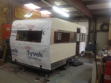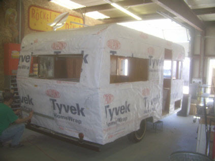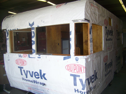 You may notice in this case the trailer was wrapped with Tyvek house wrap. There is much controversy on restorations wether or not to do this. Some say a vapor barrier is good, others say it is not. In my opinion I do not feel it is necessary, but I don't believe it hurts anything. Done right, the aluminum should be air and water tight, and I don't believe myself that it can stop condensation from forming in the walls, the two arguments in favor of wrapping.