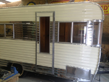 Here is something to think about if you are restoring your trailer yourself. In the case of this 1964 Chinook trailer, the owner had rebuilt the trailer himself (and did a really nice job of it!) but was intimidated by installing new aluminum skin. He asked us if we would do that step for him. Smart move, aluminum is expensive and done wrong can result in a disappointing result or even a lot of scrap aluminum. We were happy to help. He brought us the trailer looking like it does above, and took home a trailer almost finished for a fraction of what it would cost for us to do the restoration.