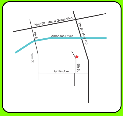 From Royal Gorge Blvd (Hwy 50) in Canon City, go south on 9th St. (Hwy 115). Take first right after crossing the river on to Griffin Ave, one block and turn north on 8th Street. We are just down the block on the east side of the street.