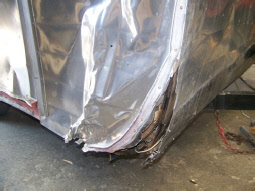 How’s this for cute? It’s only 12’ long. Somebody had tried to polish it (it was a painted trailer from the factory) and then had a little accident crunching the left front corner. Cheap marker lights we used for tail lights, one for tail, the other for turn signal. We did replace them with correct era tail lamps.