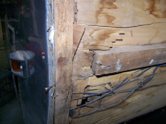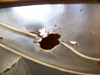 Ever wonder what could be lurking under the skin? We found a strange patch panel on the side, under it we found a bullet hole. Once we took off the skin look what we found... The bullet went right through a 110V wire leaving bare ends up against the aluminum and foil backed insulation. Yikes!