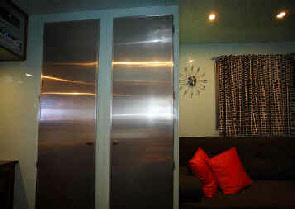 Now the interior matches the modern design of the outside. We added some high tech features... Dimmable LED lighting, full surround sound system, LCD TV, hidden magnetic locking cabinet doors, all controlled at a stainless steel control panel by the front door (think Flash Gorden). The stainless doors are for the closet and full restroom. The sofa is a restored click back that turns into the bed, the flooring is black Marmolium.