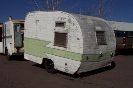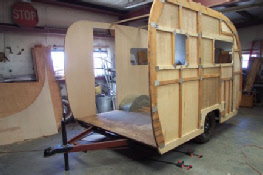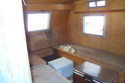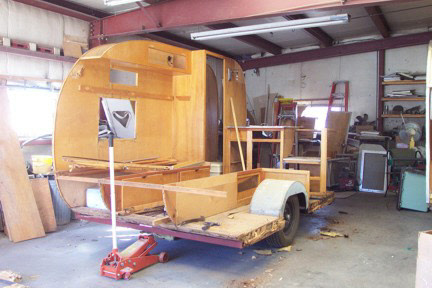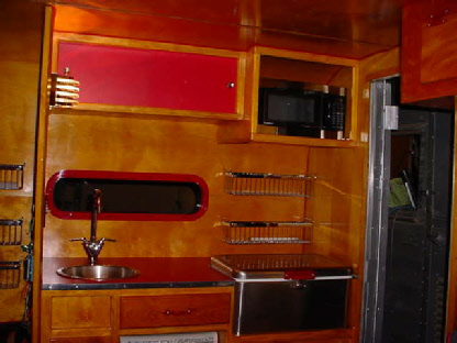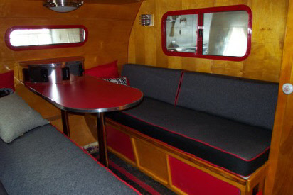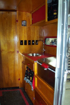 Be began this project by taking the trailer completely apart. We built new walls to accomodate the new custom built windows they wanted, and then custom built the cabinetry to thier design. Going all electric we took out the propane stove and put a microwave in an upper cabinet, added a removable ice chest in place of the ice box, and added an AC unint in the front galley. New custom flooring was laid down and custom made bed benches were built at an angle to give more foot room while standing or sitting at the table. A small restroom was added to the left of the galley.