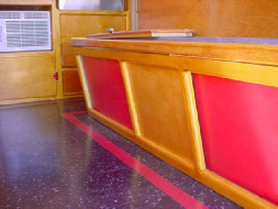 We installed some high tech looking light fixtures, each on thier own dimmer, custom built a table with entertainment center and had new cushions made using black cloth & vinyl with red piping. We used red gimp on all the wood edges to match the design.