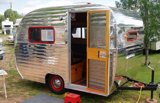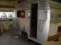 The exterior received our polished aluminum, note the custom made 1” score design through the window band. The aluminum was on both sides of the door so it blends when open, and we flipped the door from right opening to left, added a new wood screen door. The exterior also received new LED tail lights and LED beehive marker lamps.