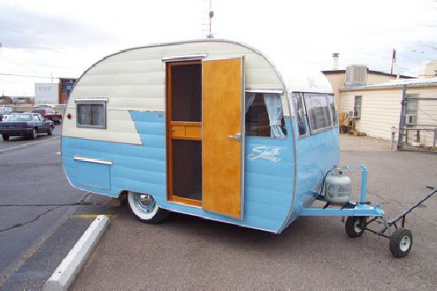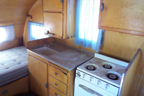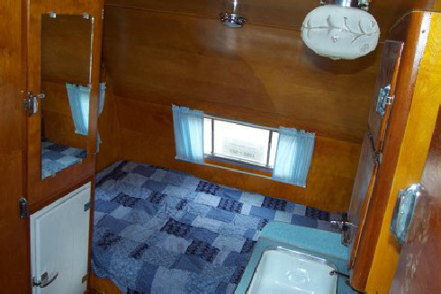 All new exterior, note the new siding has the correct 6” scores. We always use a high quality urethane automotive paint for our restorations, this one in Colonial White and Regatta Blue. All new moldings and the windows restored with all new seals. New tail and marker lights for trouble free towing. Details include one of our new wood screen doors and the classic wide white wall tires with new baby moons & beauty rings. Here it is ready for it’s cross country trip to it’s new home in Arkansas.