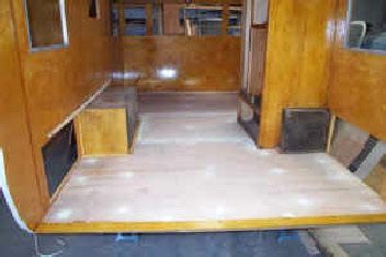 Below, the new cabin is almost back together and we laid a new checkerboard floor with the period correct 9” tiles.