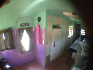 Inside I wanted to add some color to brighten it up. The walls were painted a combo of lavender and mint green, the bathroom painted purple. We left the cabinet doors the original blond wood finish. We also left the molded plastic gold glitter countertops as they were in excellent shape. Streamline trailers are unique as the cabinetry is all aluminum and painted to match the walls, so they were painted to match the new colors. For flooring I laid down a cherrywood laminate floor in the living areas, black & white checkerboard tile floor in the bathroom. We redid all the plumbing in PEX and added a new low flow toilet. We added a new black Naugahyde click back sofa sleeper with custom built end tables.