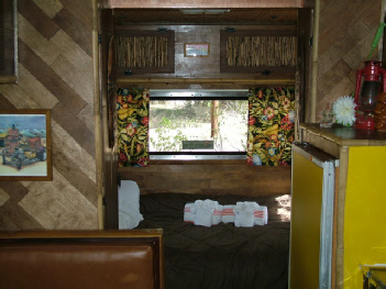 The TikiBago now resides as one of the popular rental units at our Starlite Classic Campground. We parked her next to an awning and it comes with the use of a outdoor Tiki Bar, complete with a hand crank blender for making those Pina Coladas on a hot day. It sleeps up to six, has a full bathroom and comes equipped with all the linens, towels, dishes and cookware... Just bring your clothes, food and drink and enjoy!