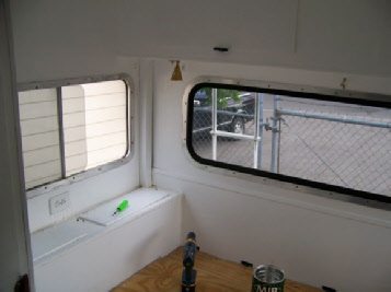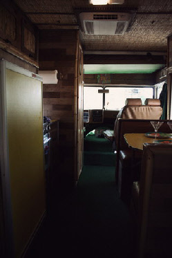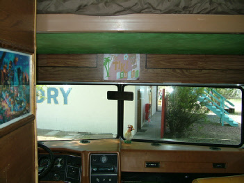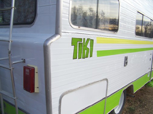The exterior is pretty much the way I got it, due to the construction there is no practical way to reskin a Winnebago. I did treat it to a new paint job in white and lime green. I duplicated the original Winnie stripes but in the green and yellow, original was orange and brown. On the rear corner where it had the “Brave” logo I hand painted the new “Tiki” logo, now dubbing this one the TikiBago. I also replaced the old rooftop air conditioner with a new Coleman unit.