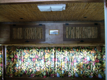 I really enjoy at times getting the opportunity to be a bit creative when restoring a camper, and this old Winnie was such a case. I purchased this 1973 Winnebago Brave from a previous owner that had let their seven year old grand daughter decorate the interior herself. Everything was covered either in latex paint or cheap contact paper... even the hardware and counter tops. With no economical way of putting it back to original it became a perfect palette to play with, and I wanted to do it on a budget. I decided it would be fun to do one up in a Tiki theme, much like the popular tiki bars of the 60’s.