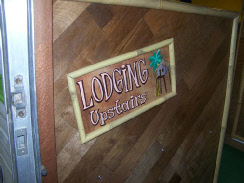 Decorating it was half the fun. Tiki stuff is fun to find, online, thrift stores, luau sections of the dollar stores, and some I created myself... The bedroom light fixtures are dollar store green plastic cups wrapped in bamboo for example. Finished up with curtains sewn up out of tropical flower print material. Final touch is the real surfboard propped up outside.