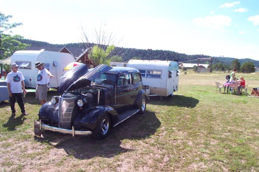 George & Pam's 73 Scotty Sportsman pulled by a 38 Chevy Sedan