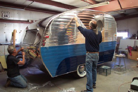 Off it goes! We painted it to match the classic 1950 Hudson tow vehicle, a show stopper combo wherever it goes! Gotta love the original port hole window in the door.